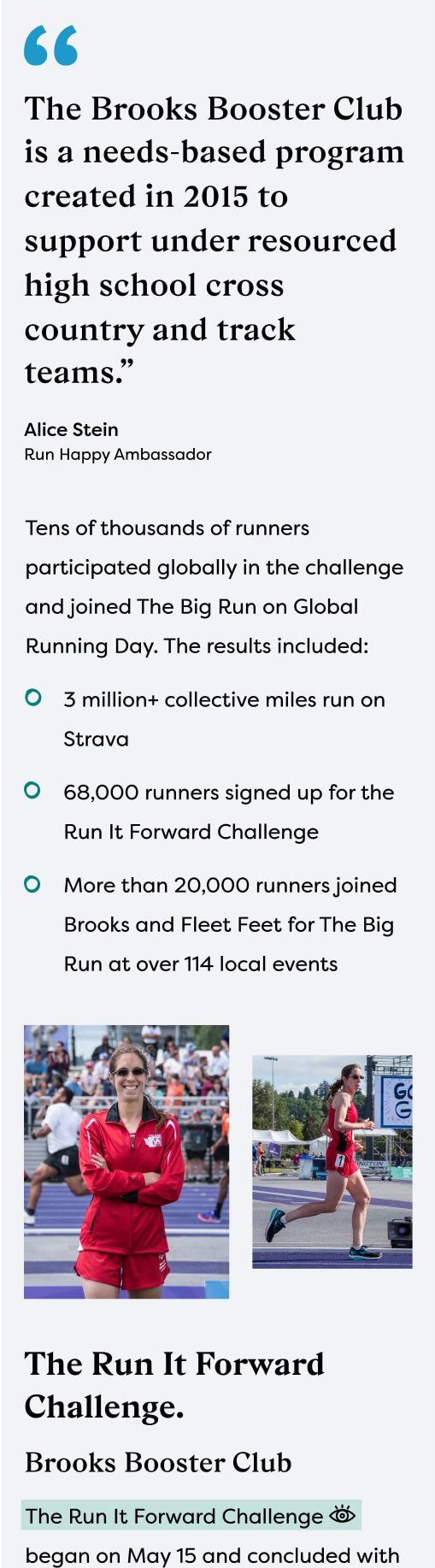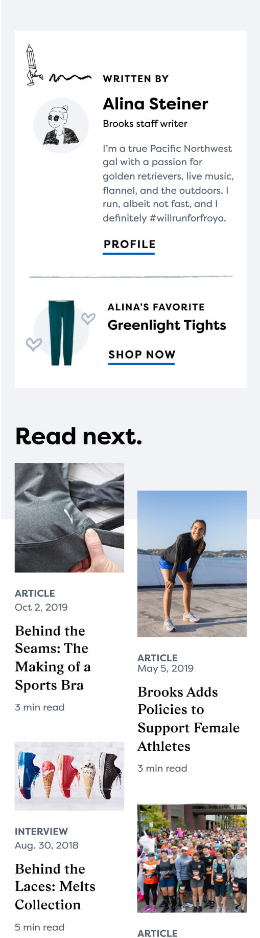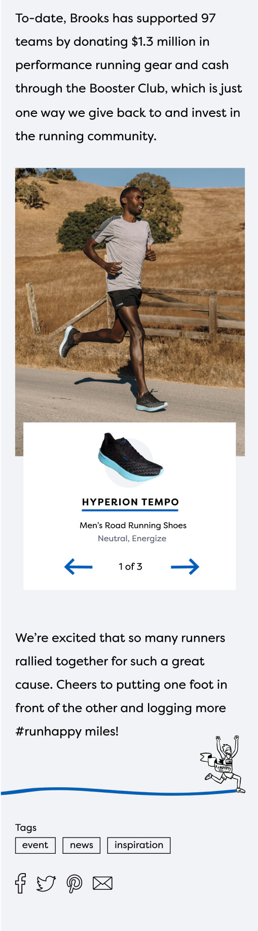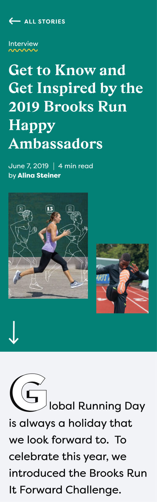 We created a dedicated space for all helpful content pieces, covering topics from training for your first 5k to nutrition and technique advice. The article page not only provides valuable information but also integrates brand elements and moments of delight to move away from traditional text-heavy formats. Every design element was carefully curated to emphasize the runner-specific perspective and reflect the core statement of "Run Happy."