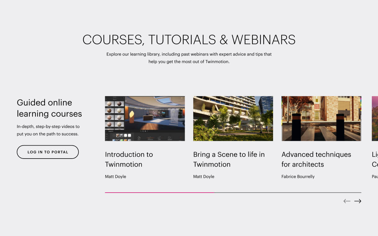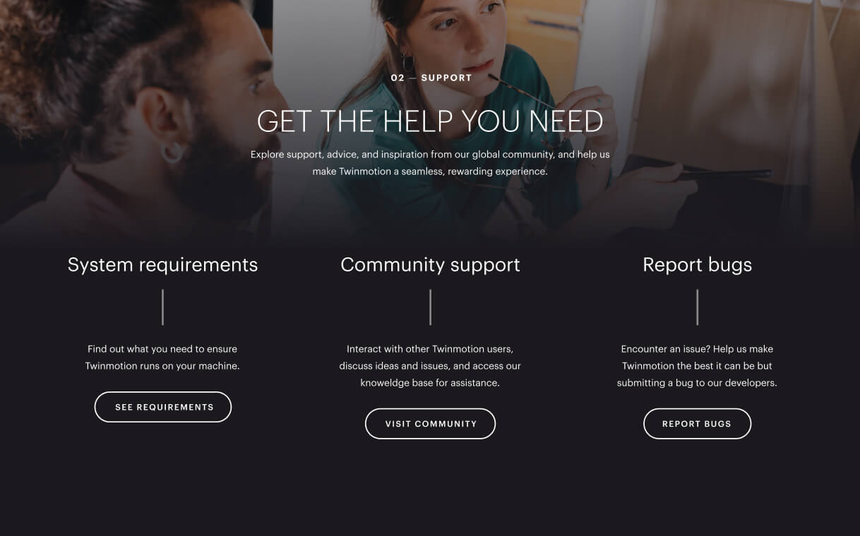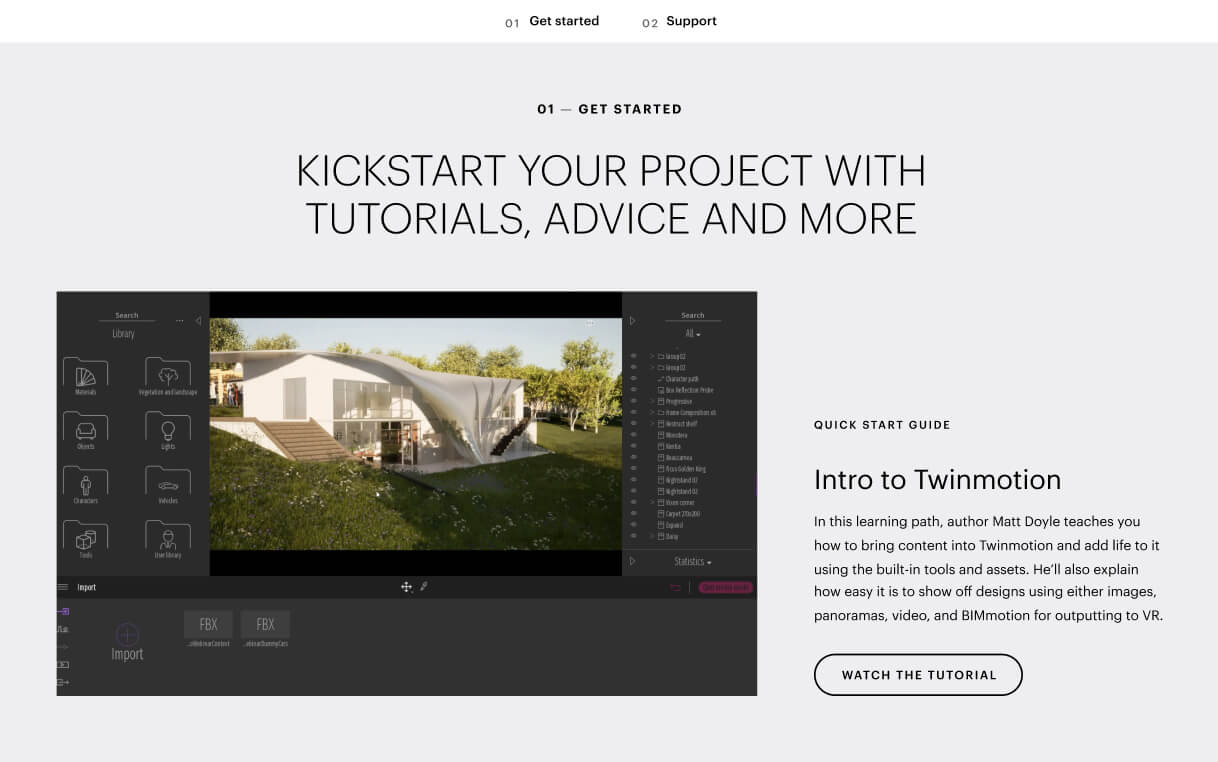 We also highlighted all the helpful tools that make switching a breeze. Throughout the experience, we've integrated support and troubleshooting content, along with quick start guides and tutorials, to address any concerns about transitioning to Twinmotion.