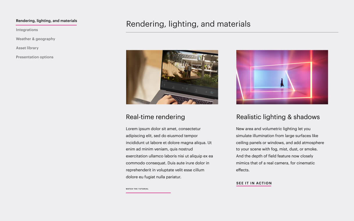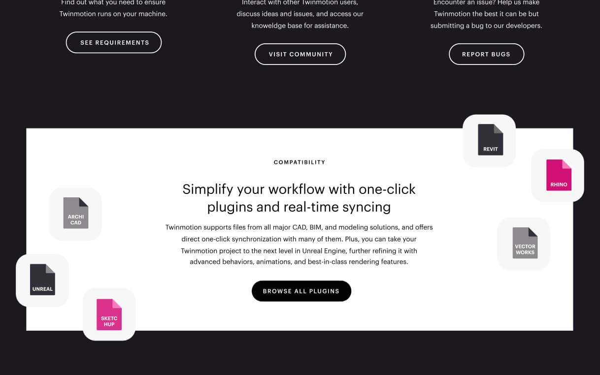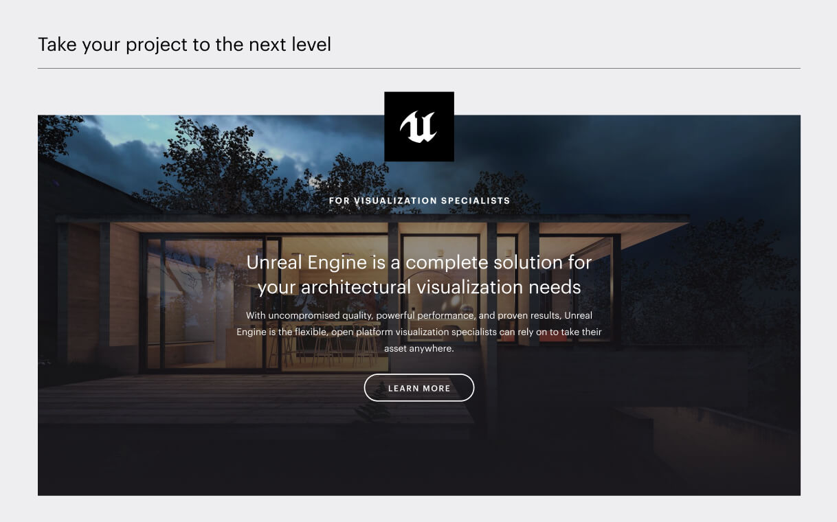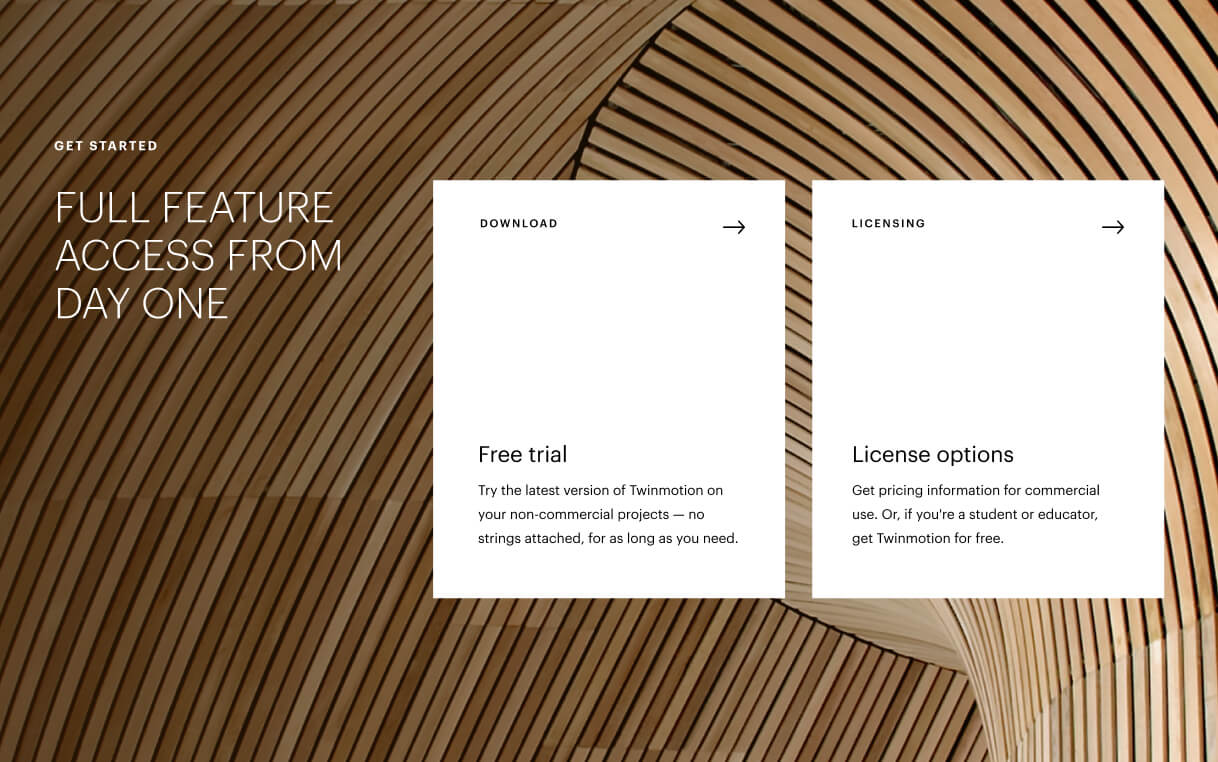 Industry pages featuring a wealth of industry- specific details: from feature highlights and starter files to learning resources, challenges, and inspiring projects within your field. Now you can delve deeper into your topic with specific feature callouts, educational content, and real- world projects accomplished using Twinmotion.