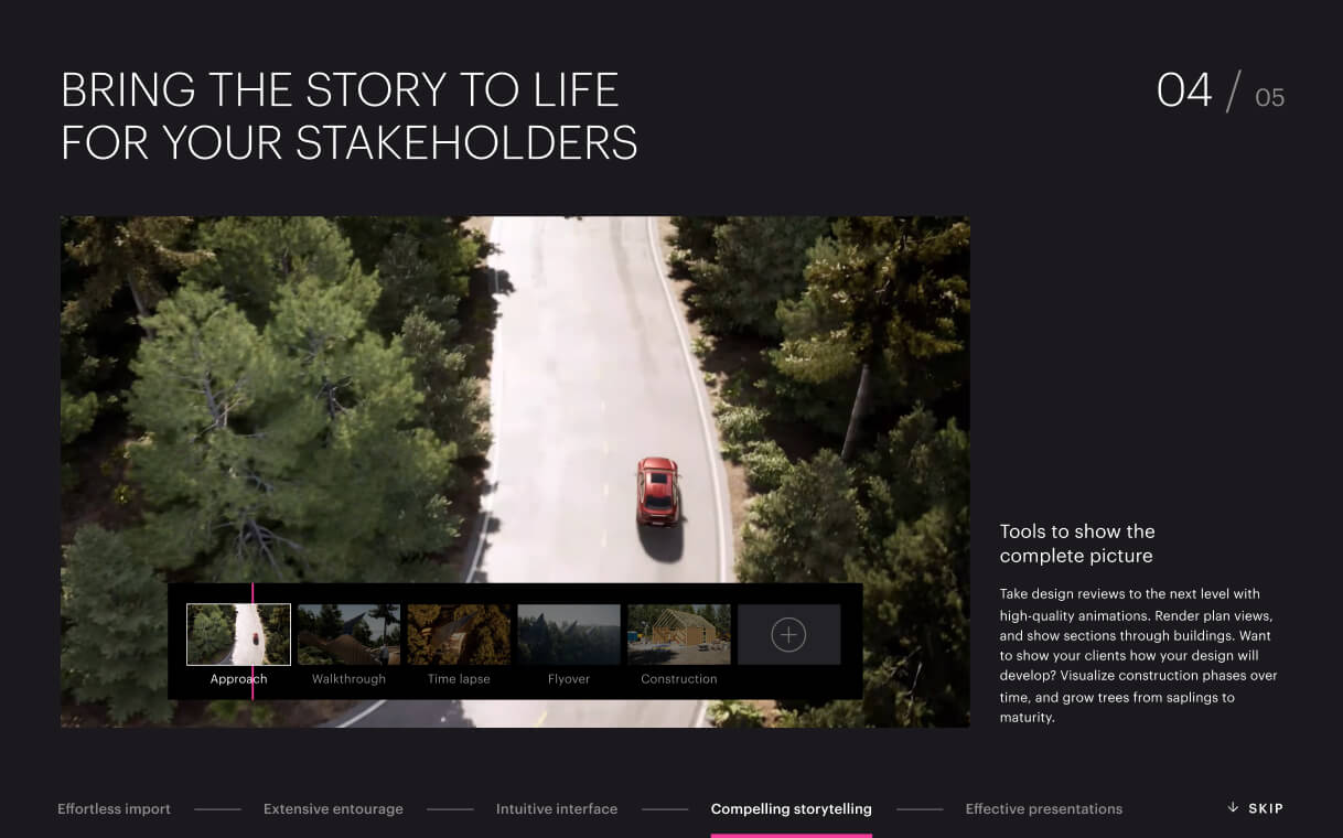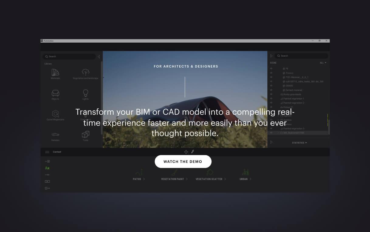 We have expanded the use cases of Twinmotion and prominently showcased them as soon as you enter the experience, demonstrating the tool's new capabilities and applications.